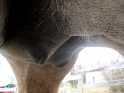 De profile, on peut voir que le poulain s'est retourné : le ventre est bien descendu. Les ligaments de chaque côté de la queue se relâchent, faisant un creux caractéristique. Le pis se remplit de plus en plus. Les tétines se sont bien écartées, elles ne sont pas pleines encore, mais le pis est de plus en plus dur et proéminent. Les muqueuses vaginales se ramollissent et s'allongent (si c'est trop de détails pour vos chastes oreilles, tant pis, il va falloir faire avec, ce sont les choses de la vie et des détails que je surveille de près chaque jour !)